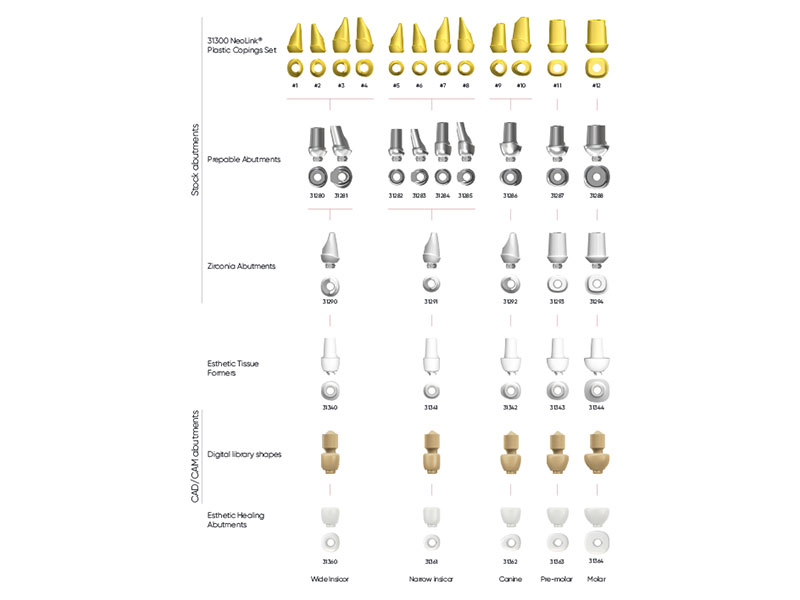 - Custom cast abutments (with NeoLinks)