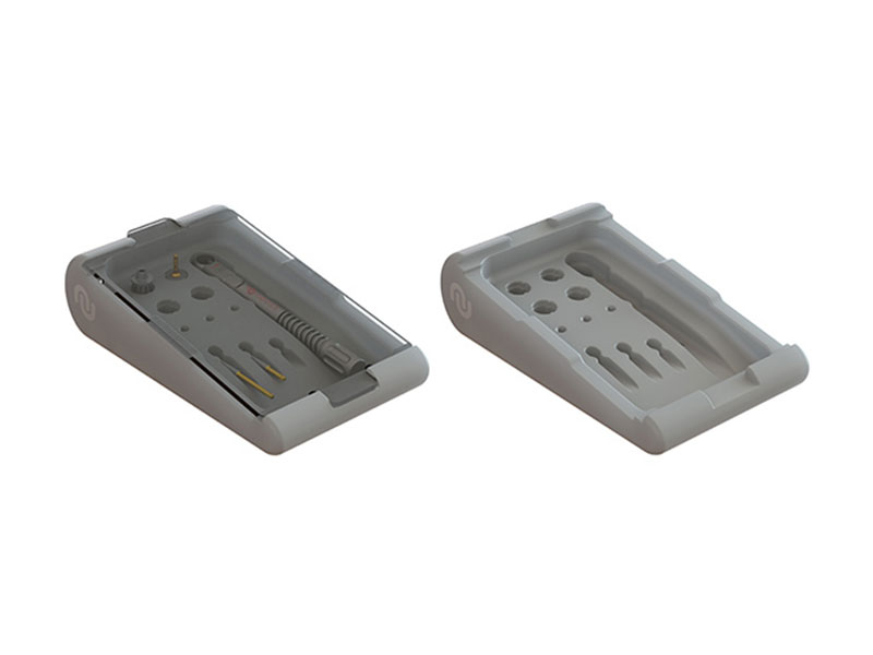 The Prosthetic Tray holds the ratchet, manual handle and screwdrivers and includes spare slots for additional components.