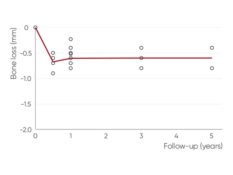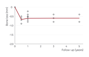 The smooth surface on the implant flange (~2mm) and the stability of the implant abutment connection has resulted in outstanding clinical results with minimal marginal bone resorption. The mean bone loss in all studies is 0.62 mm after one year, and 0.60 mm after five years.3 This indicates extremely stable marginal bone levels after a minimal bone resorption during the healing phase.