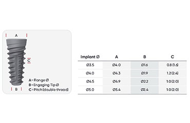 İmplantlar hızlı bir yerleştirme için "çift yivli" dir ve düşük kaliteli kemikte ek stabilite elde etmek için tasarlanmıştır.