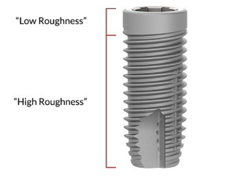 The Neoss ProActive® Straight Implant has a low surface roughness flange (Sa <0.4) designed to reduce marginal bone loss, while the rougher body (Sa 1.0) optimizes osseointegration. The low surface roughness flange allows implant placement subcrestal, bone level, or supracrestal.