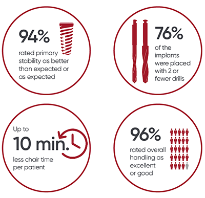 İmplantlar hızlı bir yerleştirme için "çift yivli" dir ve düşük kaliteli kemikte ek stabilite elde etmek için tasarlanmıştır.